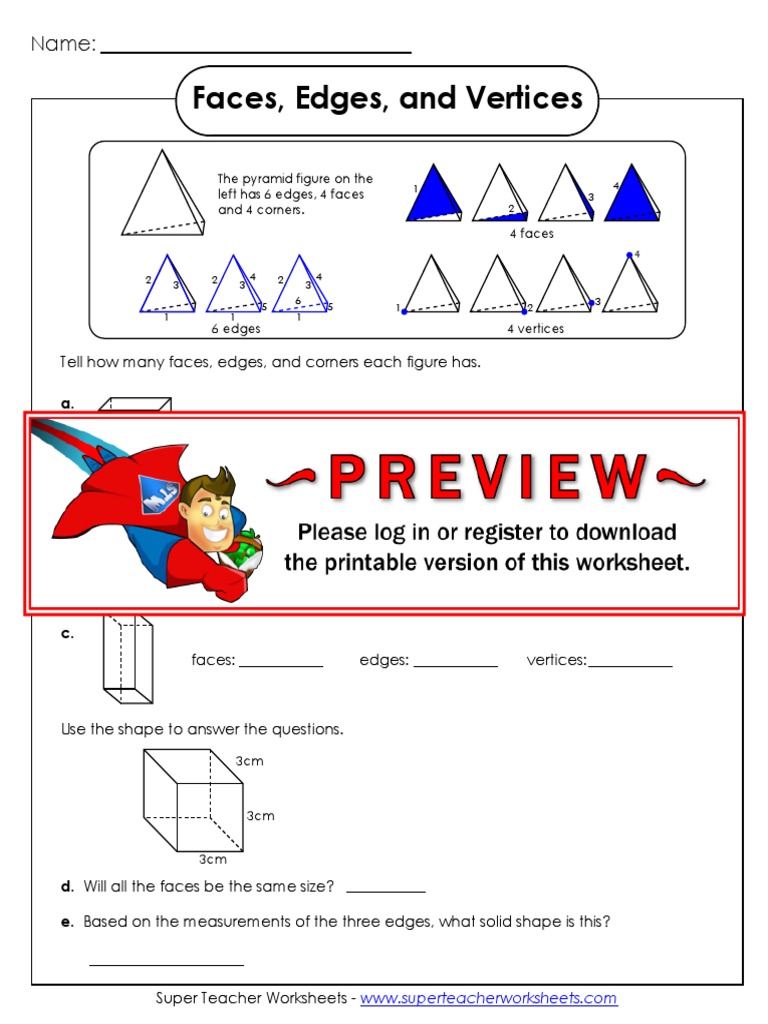 PDF Faces, Edges, and Vertices - Super Teacher Worksheets left has 6 edges, 4 faces and 4 vertices. Tell how many faces, edges, and corners each figure has. a. faces: edges: vertices: b. faces: edges: vertices: c. faces: edges: vertices: Use the shape to answer the questions. 3cm 3cm 3cm d. Will all the faces be the same size? e. Based on the measurements of the three edges, what solid shape is this ...